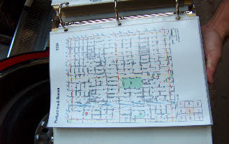 Portland Fireman holds book of speed bump locations used to aid route planing